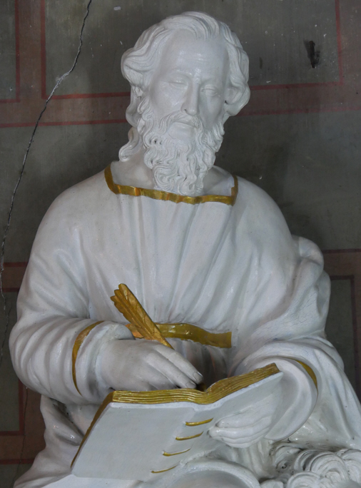 Le troisième projet était la restauration de la statue de St Marc qui se trouve dans la nef nord de l’église. Cette statue datant du 19ème siècle est inscrite à titre objet à l’inventaire des monuments historiques ( 11/1/1990 ). Le devis de restauration avait été remis à la mairie qui l’avait envoyé à la DRAC. Suite au devis de restauration de Mme Cécile De Oliveira accepté par la DRAC en mars 2025, une étude stratigraphique complémentaire sur les dorures demandée par la DRAC a été effectuée le mardi 20 mai 2025. Suite au rapport de cette étude et l’acceptation du nouveau devis de restauration, Mme Cécile De Oliveira a réalisé cette restauration du 1er au 12 décembre 2025.