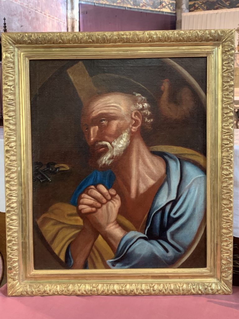 Le tableau de l’église « Le Remords de St Pierre » a été le premier projet de restauration retenu par le CA de l’association en Septembre 2022. C’est un tableau datant du début du 18ème siècle, inscrit au titre objet à l’inventaire des monuments historiques ( 11/1/1990 ). Le cadre de 83 x 63cm et la toile de 59 x 49 cm toile étaient à restaurer. Les devis de restauration remis à la mairie avaient été envoyés à la DRAC. Le tableau étant propriété de la commune, la mairie avait reçu en novembre 2023 l’aval de la DRAC, Direction Régionale des Affaires Culturelles pour lancer cette restauration. La mairie ayant donné l’autorisation à l’ASESPL de procéder à cette restauration, le tableau avait été remis le 20 mars 2024 à l’atelier de restauration de Mme Sonia Demianozuk de Gif-sur-Yvette pour la toile et à Monsieur Christian Maury pour le cadre. La restauration s’est terminée en 2025 et le tableau restauré a été réceptionné le mardi 9 décembre 2025. Il sera prochainement exposé dans l’église.