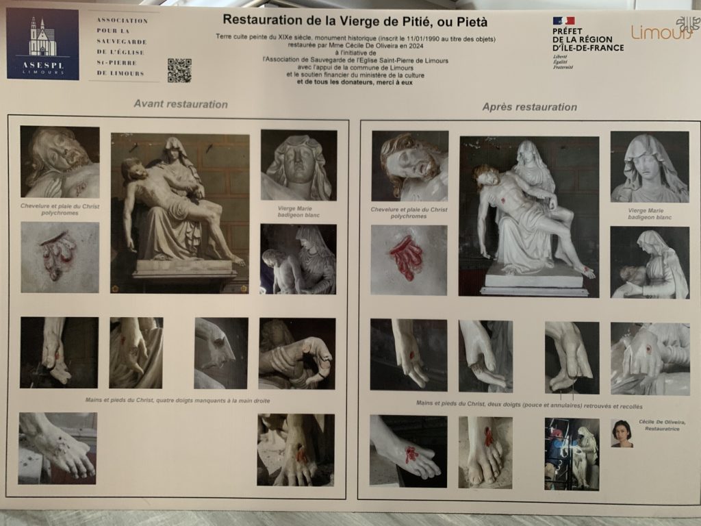 Panneau A0 montrant les différentes parties restaurées de la statue Piétà.
